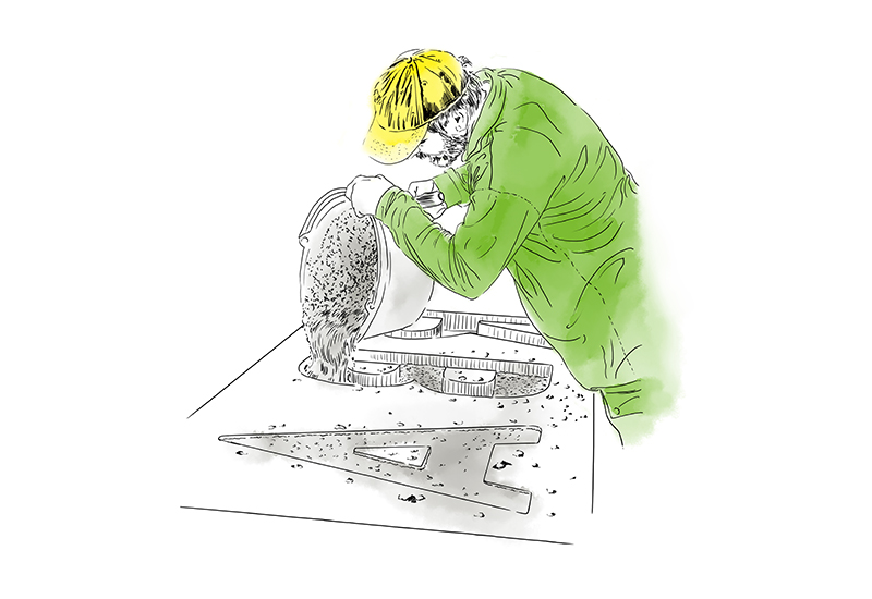 «Da bei uns in der Betonmanufactur kein Produkt im Standardsortiment ist, ist es natürlich auch für uns oft ein Ausprobieren und Testen. Das ist wichtig, damit wir hinter dem fertigen Produkt stehen können.» sagt Martin Wüest. Danach folgt eine Kostenschätzung in Form einer detaillierten Offerte. Dabei ist Transparenz ein relevanter Punkt. Wenn alles passt, werden Nägel mit Köpfen gemacht. Wurde nicht schon vorher ein Muster gefertigt, gibt es nach der Auftragserteilung nochmals die Möglichkeit dazu. Gerade bei eingefärbtem Beton, bei dem das Produkt an sich bereits klar definiert ist, bieten wir unseren Kundinnen und Kunden gerne die Möglichkeit, die Farbe anhand eines Farbmusters zu prüfen. Gibt es keine Anpassungen mehr, sind wir mit der Umsetzung an der Reihe…