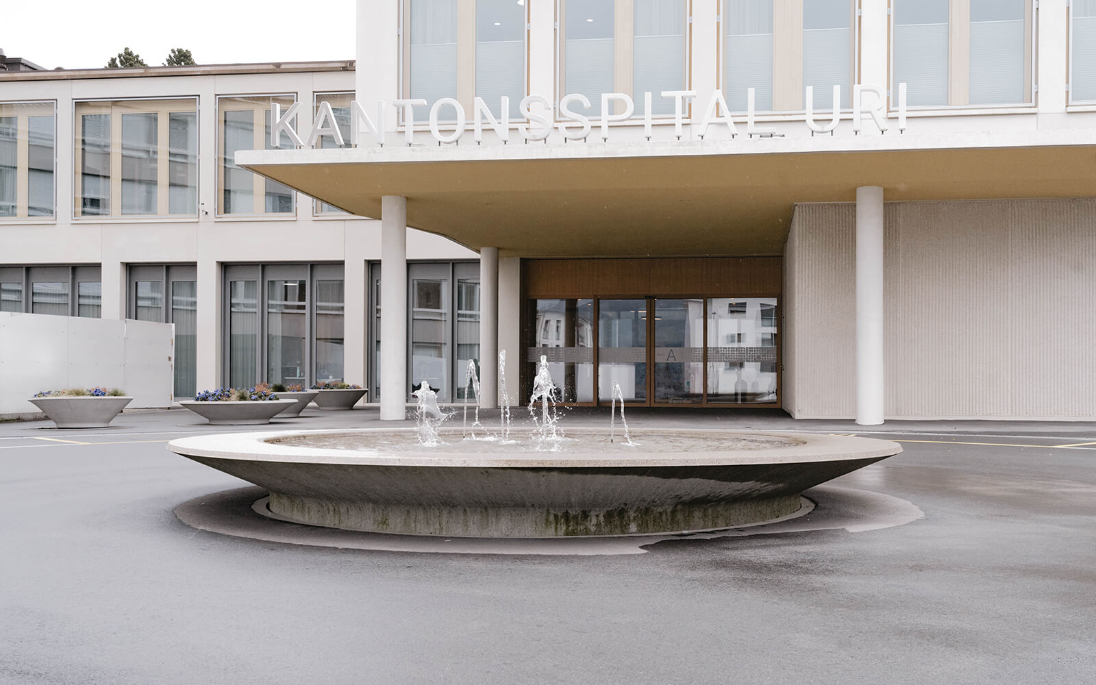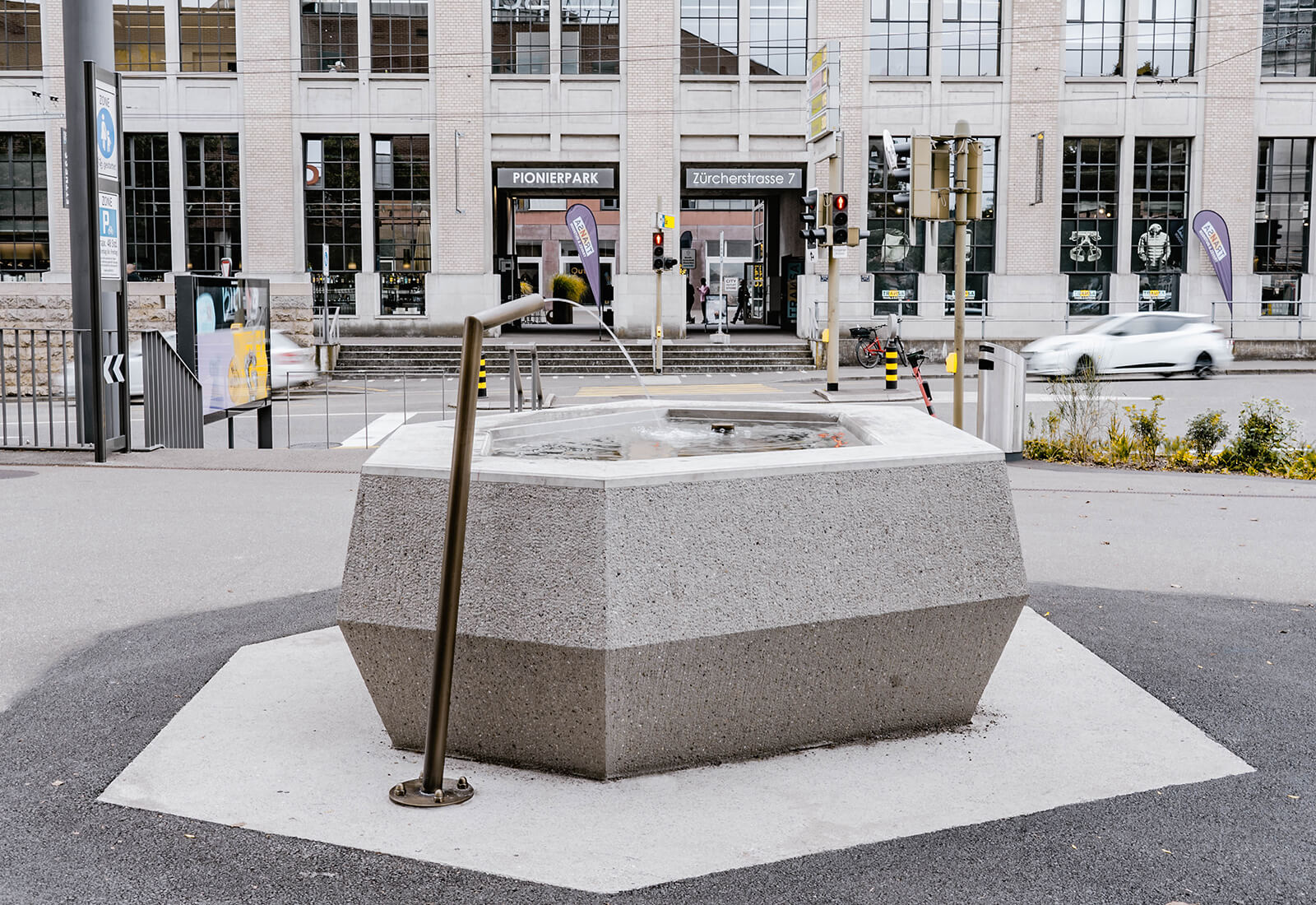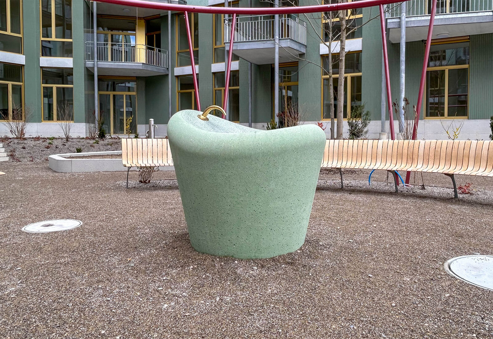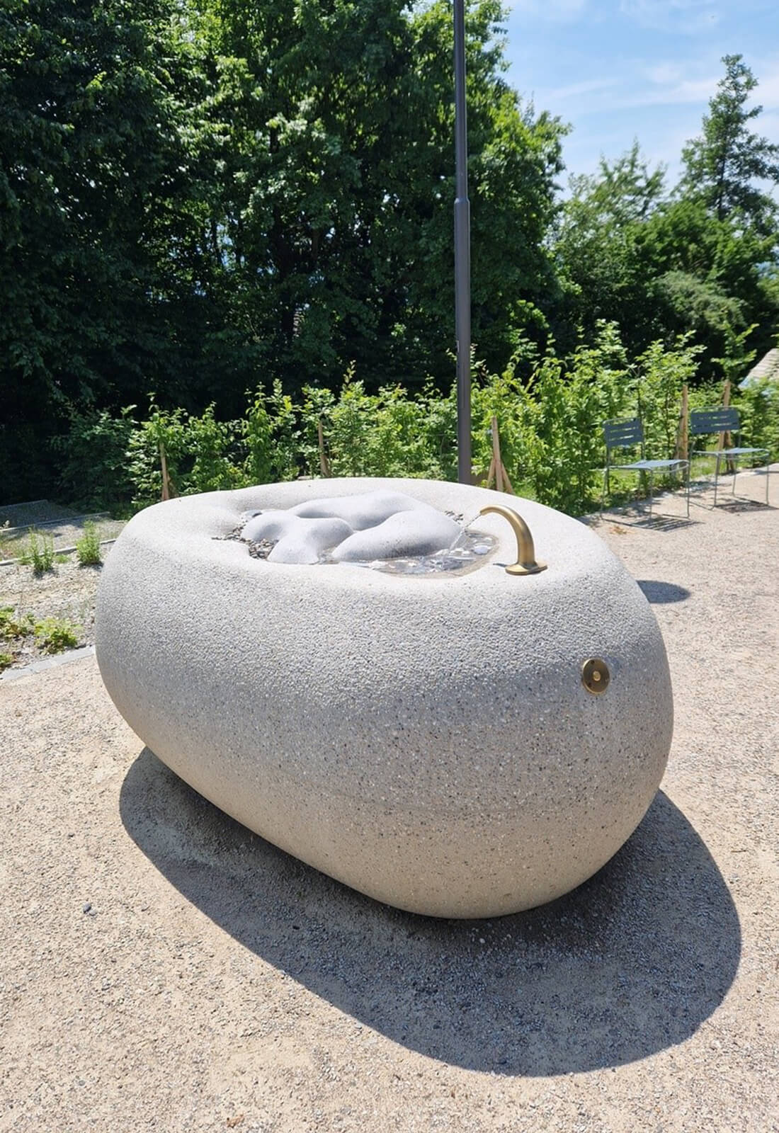 Ausführungsdetails: Weisszement inkl. 4 % grün, aussen gestrahlt, Wasserbecken geschliffen, Freiform gemäss Architektenplanung