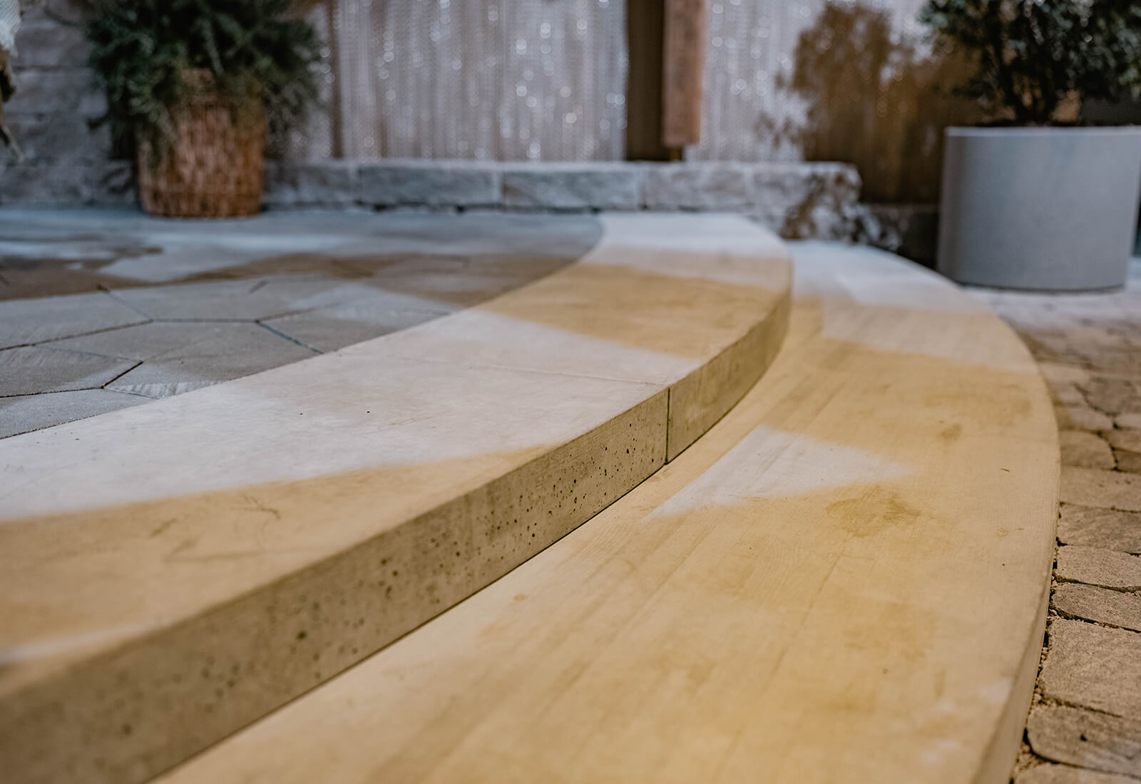 Bauminsel: Pflanzengefäss mit geschwungener Form und geschliffener Oberfläche inkl. Aussparungen für Leuchten