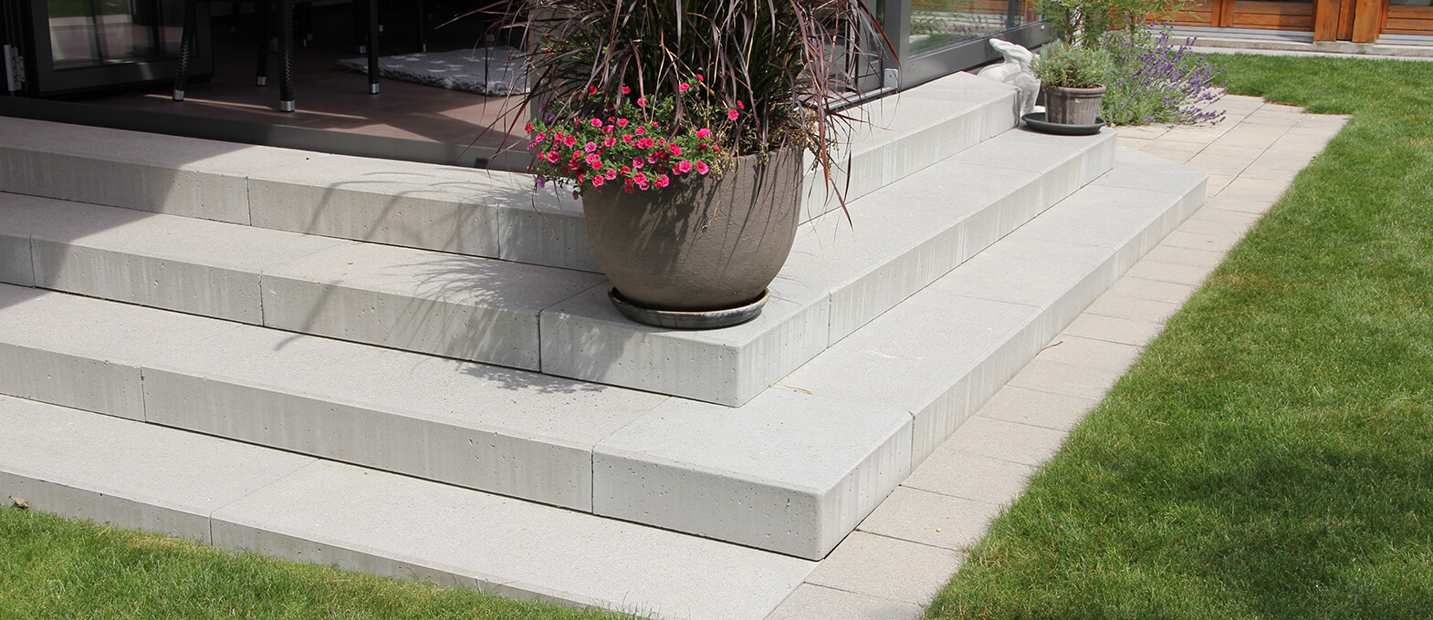 Unsere unterschiedlichen Treppenstufen sind einfach an die jeweilige Bausituation anpassbar und dank ihrer optischen Vielfalt prädestiniert, um kontrastreiche Niveauübergänge zu erstellen. Die grosse Farbpalette, diverse Tritthöhen und unsere Stufen nach Mass lassen viel Raum für Flexibilität. Die Oberflächenstrukturen der Treppenstufen reichen von glatt über gestrahlt bis hin zu Treppenstufen, welche mit Rundkörnern versehen sind. Sie finden bei uns die klassische, schlichte Betontreppe, wie auch elegante Blockstufen mit Holzstruktur oder einladende Römertritte mit leicht vorstehender Trittkante. Viele unserer Treppenstufen passen optisch zu unseren Pflastersteinen und Platten. Sie fügen sich somit perfekt ins Gesamtbild einer Umgebungsgestaltung ein.