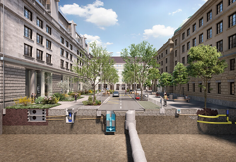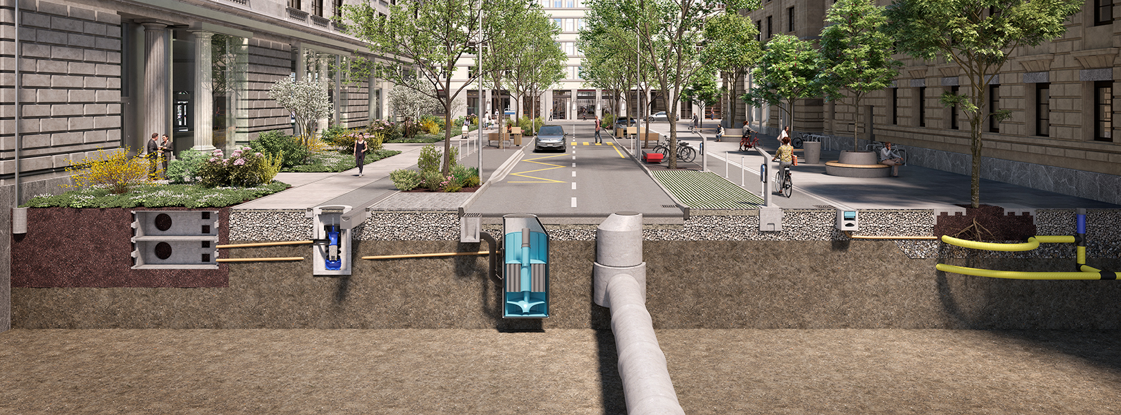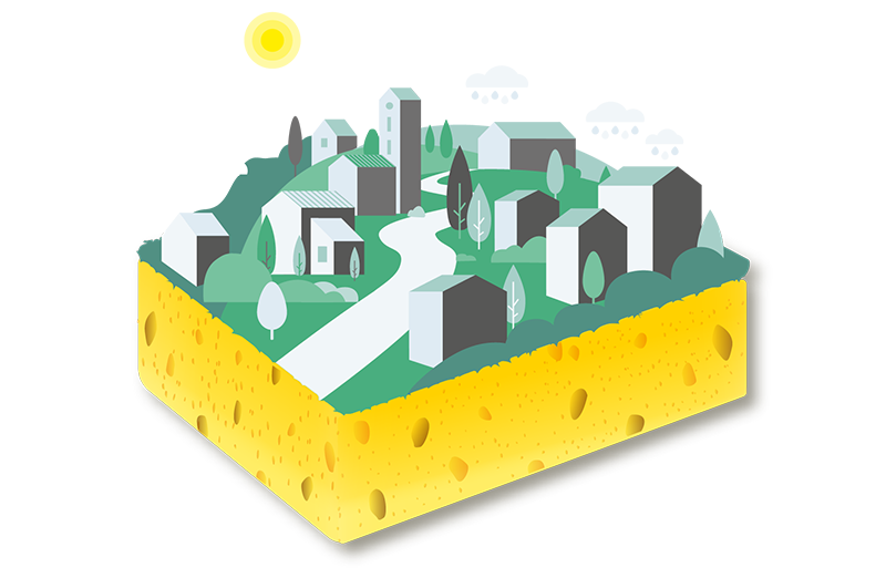 Das Prinzip der Schwammstadt ist erstmal relativ einfach erklärt: Regenwasser wird lokal im Boden aufgenommen und wie in einem Schwamm gespeichert, anstatt es in die Kanalisation abzuleiten. Ganz so einfach, wie es sich im ersten Moment anhört, ist es aber doch nicht. Hinter einer Schwammstadt steckt ein ganzes Konzept – viele Komponente spielen eine entscheidende Rolle und setzen eine professionelle Planung voraus; Beläge sind das eine, aber auch Bäume und Grünflächen, und die gesamte Bewässerung spielen eine wichtige Rolle.